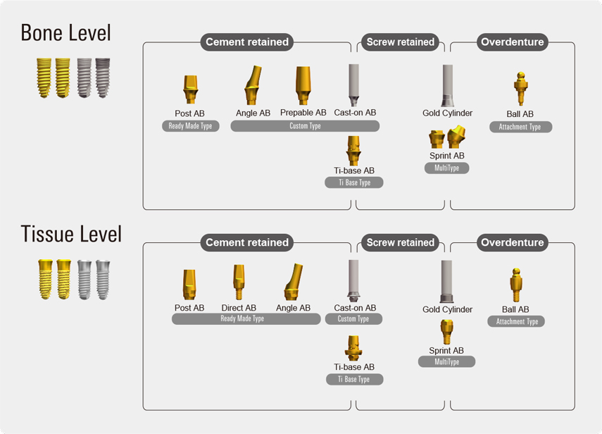 Extensive lineup of parts for more diversified and sophisticated prosthetic design.As the concept of implant prosthesis changes and CAD/CAM technology advances, prosthetic designs are becoming increasingly diversified and sophisticated. Our product lineup offers a variety of parts, not only for cement and screw retained restorations and overdentures, but also for CAD/CAM restorations.