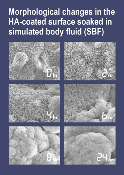In the simulated body fluid soaking test, deposition of the crystalline phase, which was presumed to be an HA layer, was observed in minute areas on the surface at four hours of immersion, and this crystalline phase showed growth over time.