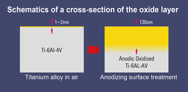 The surface is anodized to form a 130-nm thick oxide layer, which has excellent properties, including enhanced intraoral esthetics by the coloration.